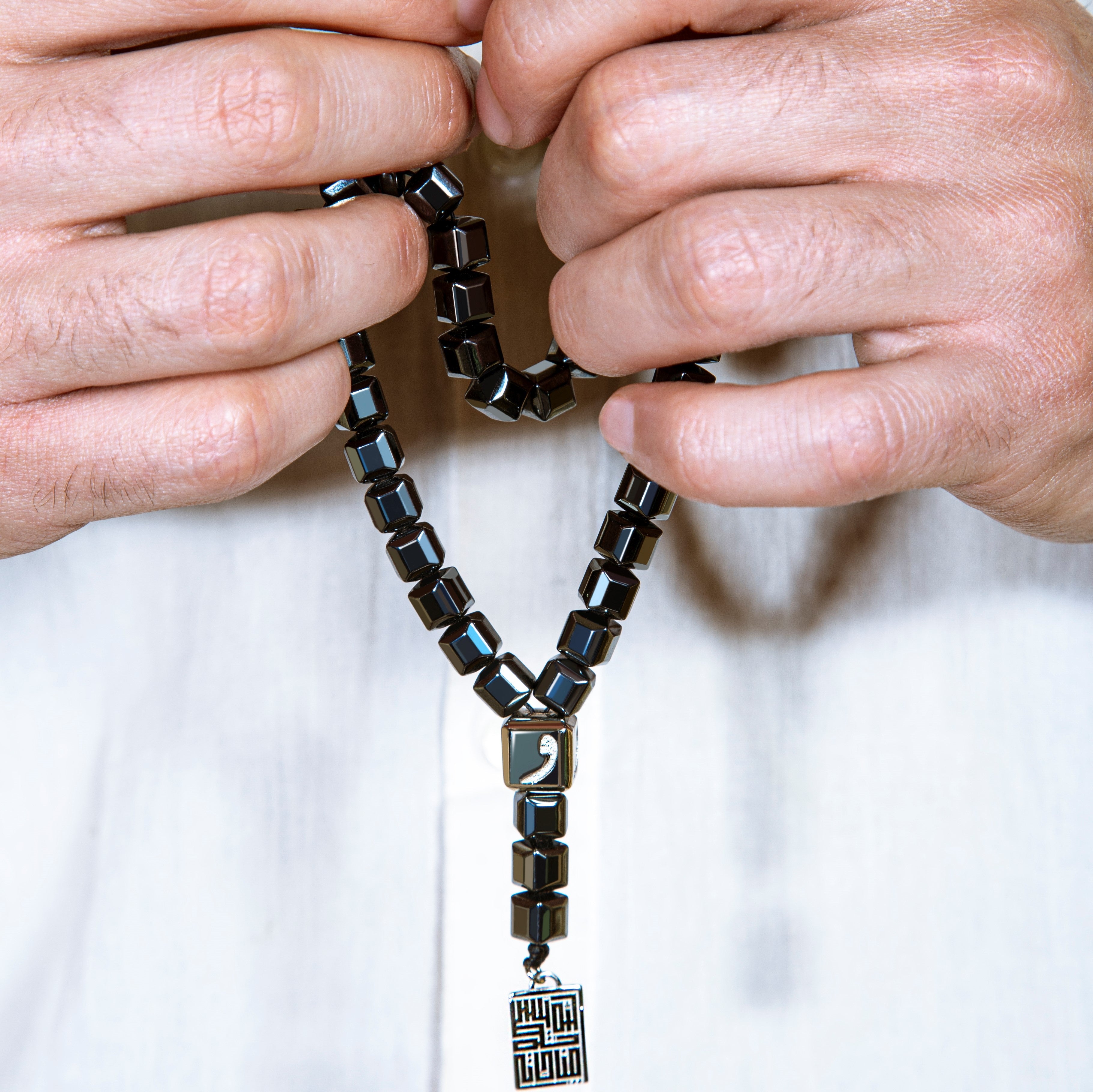 Made with Hematite. Threaded with silk thread and 925 Silver Accessories. Each one of our prayer beads is set with a charm engraved with a different saying. This prayer bead has the quote : الله يسمع مناداتي، God Hears My Call.